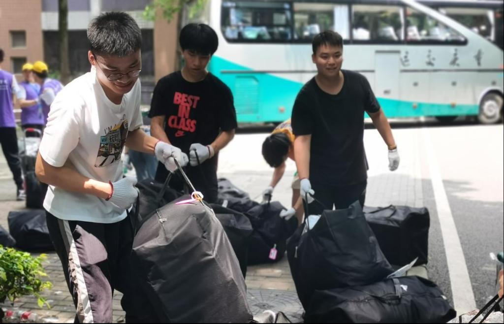 上午9点半,志愿者们分别在北六、北十五、南五三个楼栋门口集合,等待2021级同学和“行李部队”的到达。满载行李的搬迁车辆抵达后,志愿者们化身“大力搬运工”和“流水传送带”,力量满满,默契配合,热情地帮助同学们搬运行李。各楼栋负责老师紧跟志愿者大部队,维护现场秩序,并提醒同学们注意脚边物品,保持距离,防止拥挤,注意上下车安全,为搬迁工作的顺利开展和同学们的安全保驾护航。