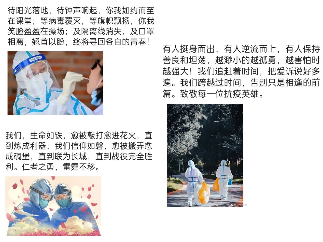 “万物复苏必有时,疫去安来春可期”。此次活动不仅向所有奋战在抗疫一线的工作者们致敬,也让广大经济学子更深入地感受到“我将无我,不负人民”的精神,鼓励同学们向抗疫工作者学习,用行动尽显责任担当,用无畏共筑防疫高墙!