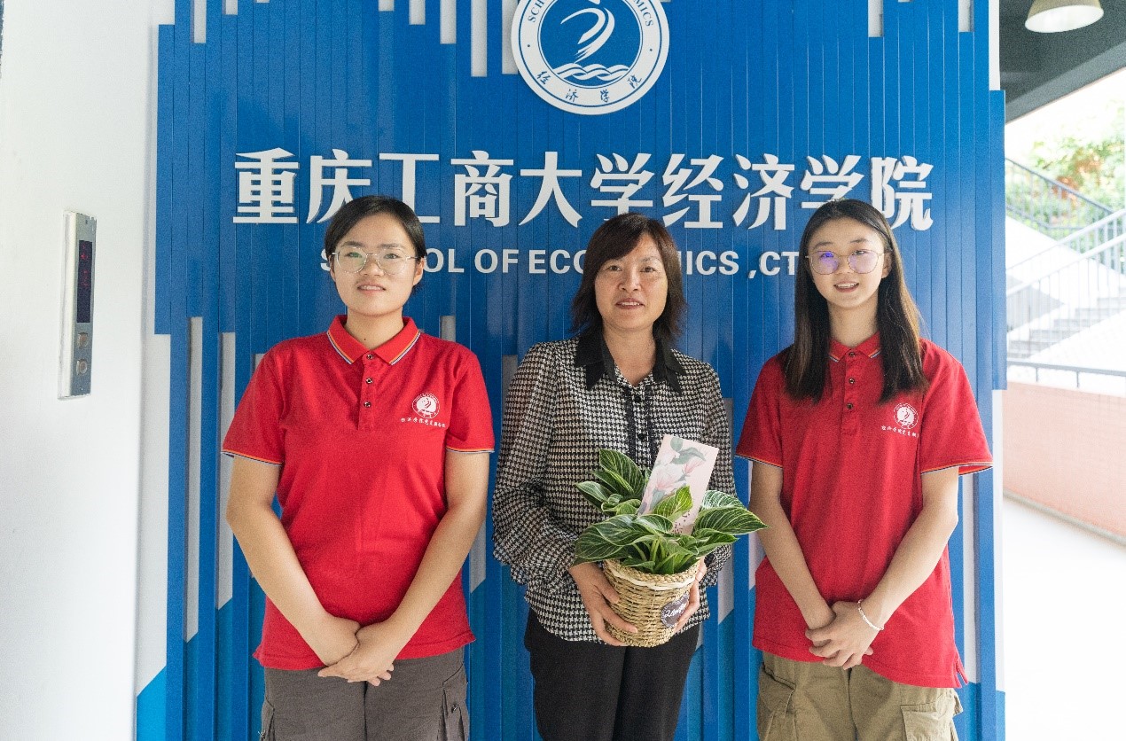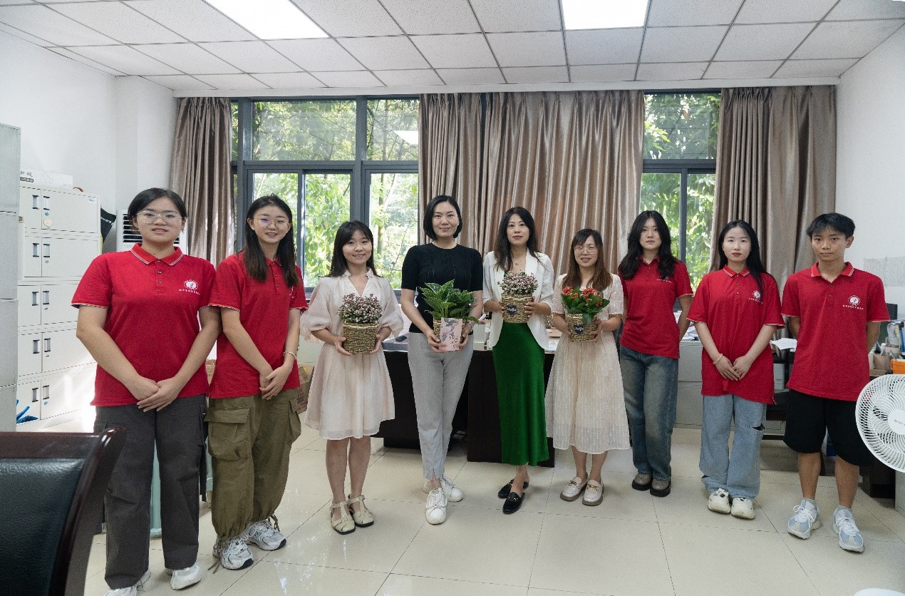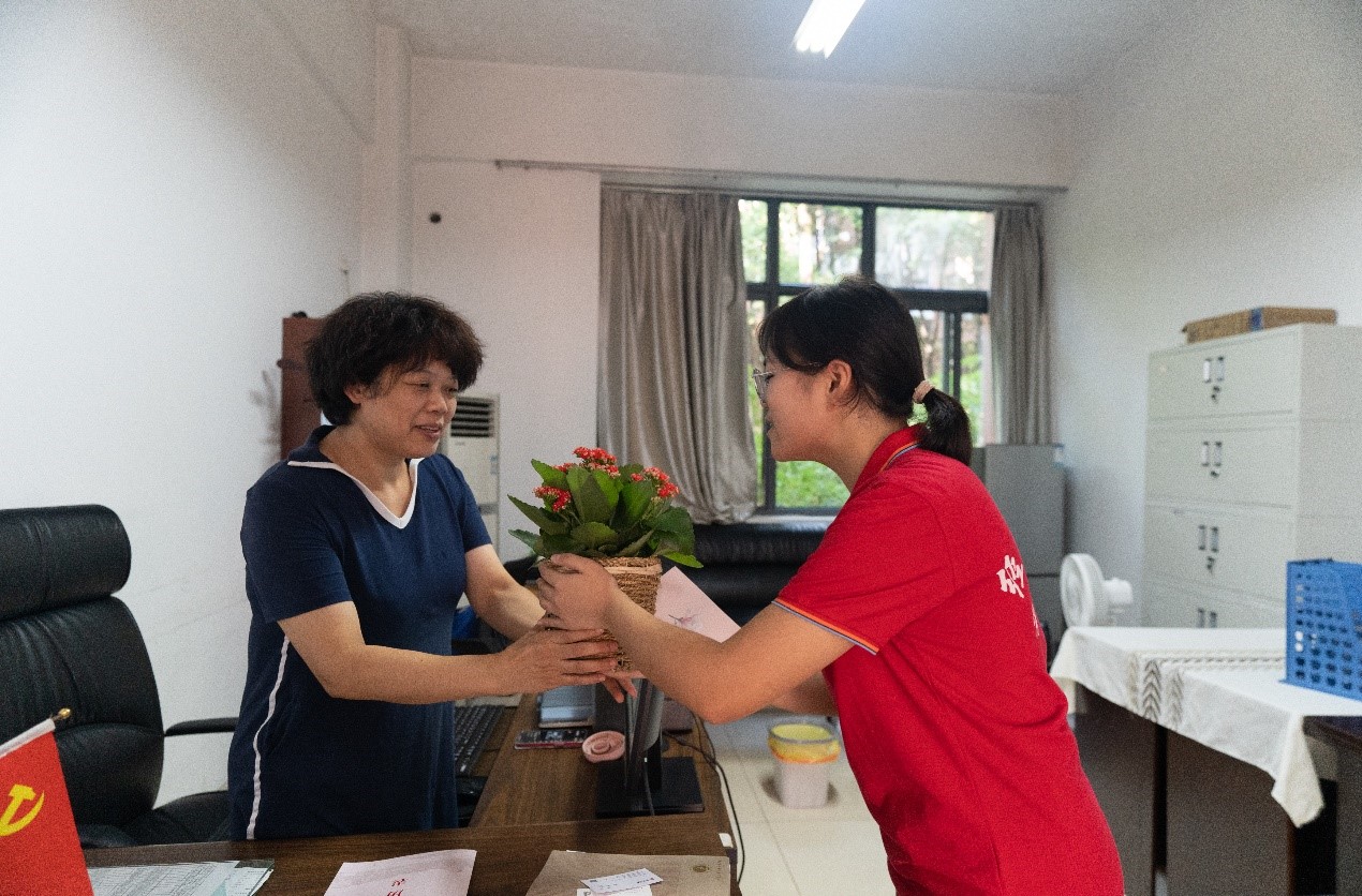 (图为经济党服成员为学院领导和老师们送上鲜花与祝福,邓彬悦摄)