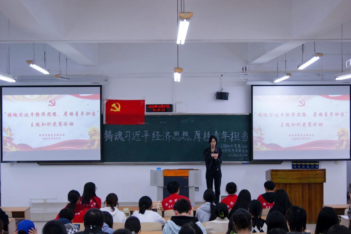 新时代孕育新理论,新理论引领新实践。为立足“学与思”“践与悟”,从青年学子的角度,深刻阐述习近平新时代中国特色社会主义经济思想蕴含的科学性、人民性、时代性、开放性,充分体会其真理力量、理论价值和实践伟力,进一步增强站员们对习近平新时代中国特色社会主义经济思想的认识,体会其中深刻内涵,太阳成集团tyc539党员服务站于10月27日在博智楼07208举办了“铸魂习近平经济思想,厚植青年担当”--主题知识竞赛活动。本次活动由22国贸二班孙佳琳同学主持,共80余名站员参与其中。