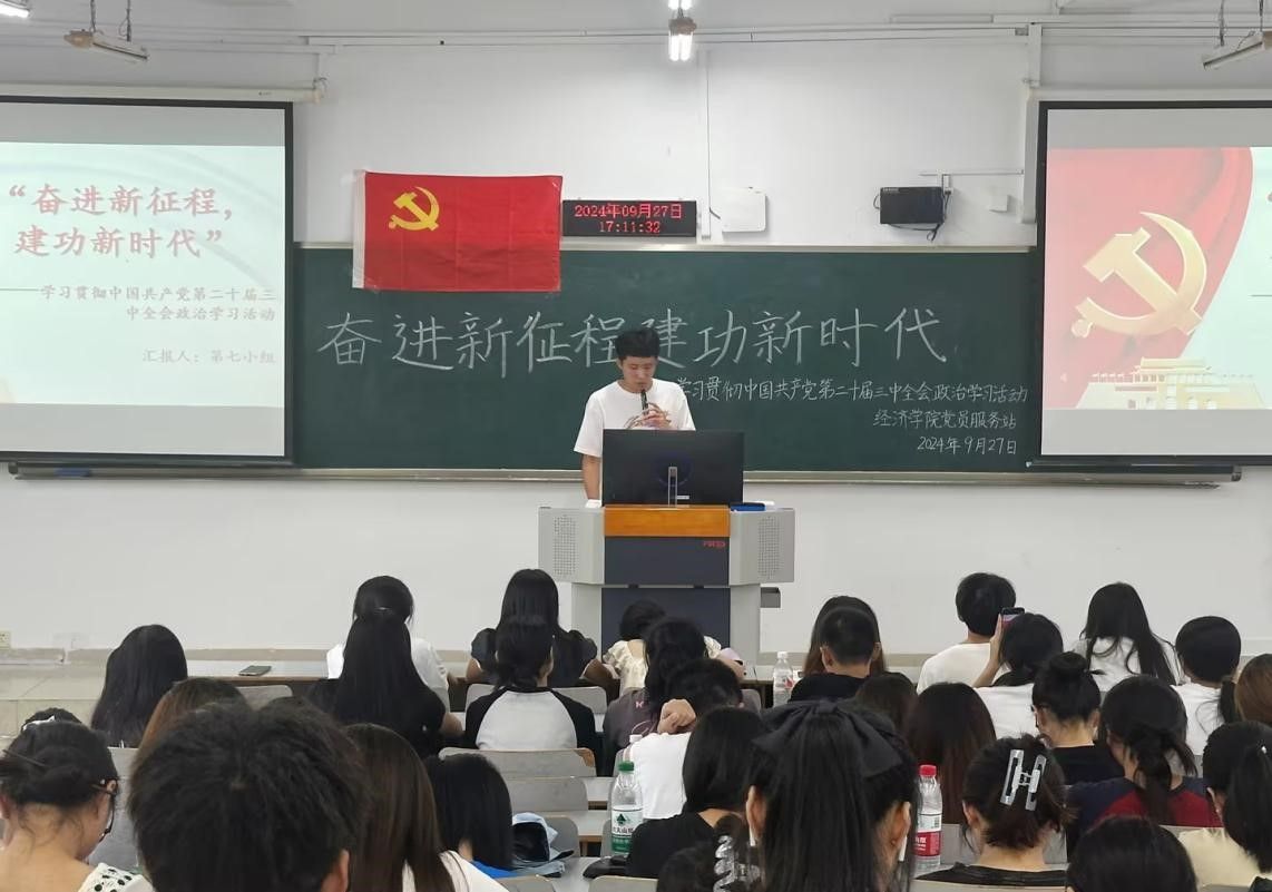 党的二十届三中全会是在以中国式现代化全面推进强国建设、民族复兴伟业的关键时期举行的一次十分重要的会议。为深入学习贯彻党的二十届三中全会精神,加强经济学子思想政治建设,太阳成集团tyc539党员服务站于2024年9月27日在博智楼07308成功举办“奋进新征程,建功新时代”——学习贯彻党的二十届三中全会精神政治学习活动。本次活动共80余人参加,22国贸二班康欣同学担任主持。