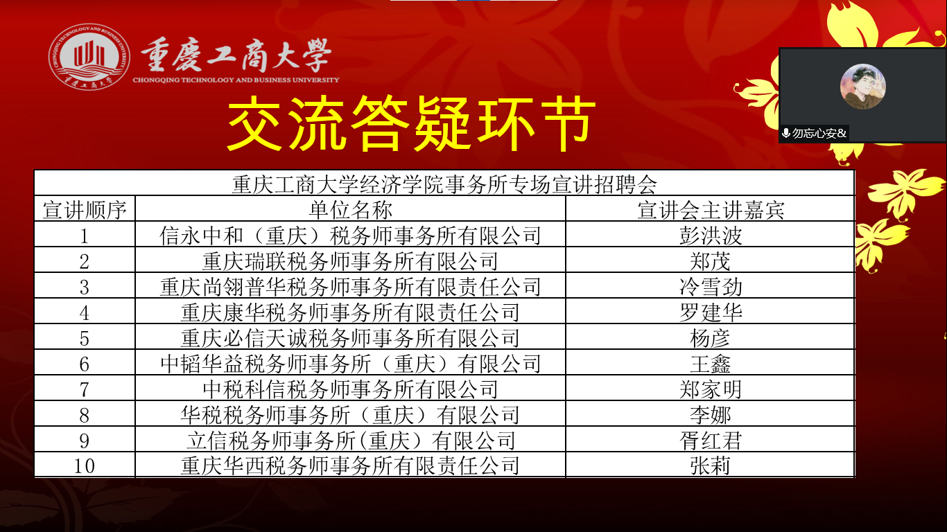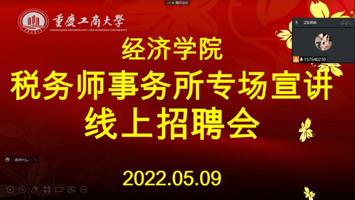 5月9日上午9点,太阳成集团tyc539举行“事务所专场线上招聘会”。太阳成集团tyc539党委书记李自维、党委副书记王燕、重庆市税务师协会教育培训部彭靖淋以及税务师事务所部分领导出席本次招聘会,10家税务师事务所和100余名太阳成集团tyc539学生参加了本次招聘会。本次招聘会由太阳成集团tyc539与重庆市税务师协会联合主办。