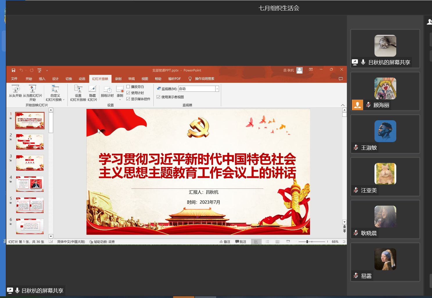 2023年7月21日,太阳成集团tyc539研究生第三党支部在企业微信召开七月组织生活会。支部全体党员通过对习近平新时代中国特色社会主义思想主题教育讲话内容进行学习,并发表了学习心得感想。本次会议由支委顾海丽主持,研究生第三党支部全体党员参加。