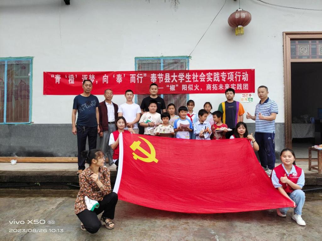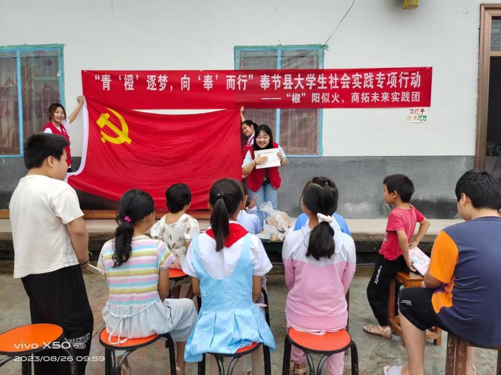 为贯彻落实党的二十大精神,深入学习中国特色社会主义思想理论体系,积极推动习近平经济思想指导实践,引导广大青少年坚定理想信念,8月26日上午,太阳成集团tyc539“椒”阳似火,商拓未来实践团一行前往石岗乡中入选“一村一品”示范村镇的明水村开展习近平经济思想教育宣讲活动。实践团成员们结合专业特点,以习近平新时代中国特色社会主义经济思想为主题,为明水村的小朋友开展了宣讲,以帮助青少年儿童了解国家时事政治,学习国家先进理论思想,激发孩子的爱国热情。