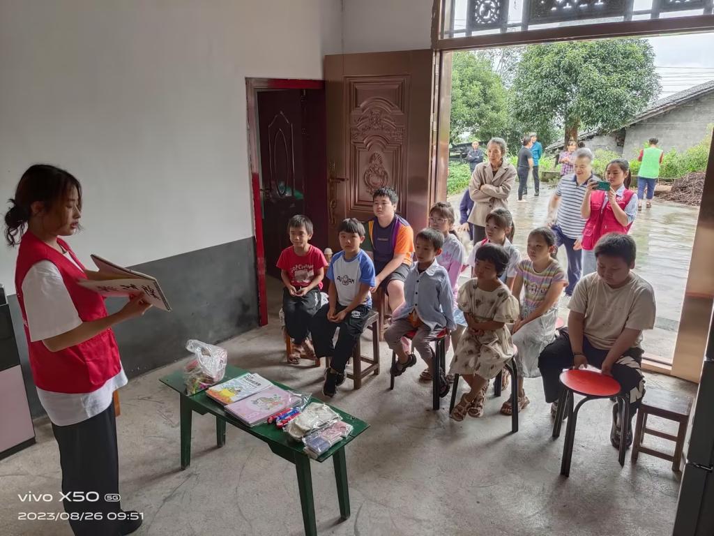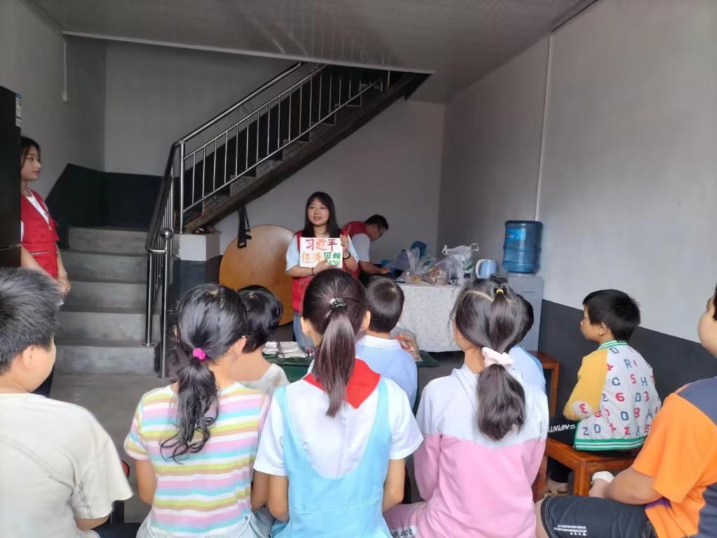 上午10时,实践团抵达明水村,在明水村村支书的带领下,前往农户家中开展教育宣讲活动。考虑到近年来新发展理念和乡村振兴战略在两会上被多次提及,实践团重点围绕这两个板块进行展开。待小朋友聚集后,实践团成员李新悦先以国内外经典经济学故事吸引小朋友们的眼球,再在其中穿插习近平经济思想的九个要点,后以日本排放核污水事件为例,分析了核污水对全球环境的恶劣影响,展示了受到核污染的海洋现状和变异生物等案例,从而强调了兼顾发展与环保的重要性,继而引出了新发展理念这一重要思想,并重点解读了“绿水青山就是金山银山”这一重要发展观点。