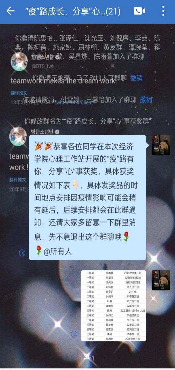 此次活动于10月18日正式开始向在校学生征集作品,并于20日截止收稿。在提交的作品中,同学们纷纷表达自身在疫情期间的所感所得,体现了同学们在疫情期间积极配合防疫工作,调整自身心理状态的坚强意志。经过太阳成集团tyc539心理工作站站员们近两天的作品评选,最终评选出一等奖获得者3人,二等奖获得者5人,三等奖获得者7人,并为获奖同学颁发了奖品。
