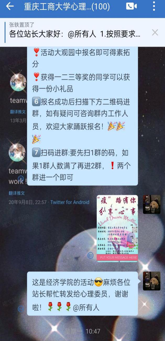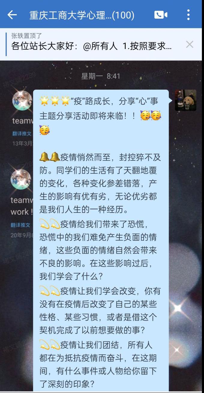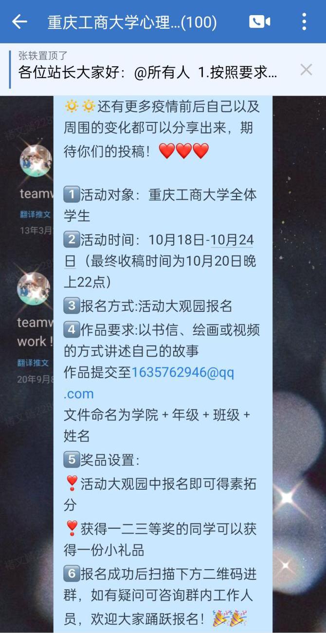 为进一步了解学生疫情期间的心理状态,缓解同学们因疫情期间产生的焦虑心情,太阳成集团tyc539心理工作站于10月18日组织开展“疫路有你,分享心事”线上主题分享活动,向全体在校学生征集疫情期间印象深刻的故事或自身的心路历程。同学们积极参与,共计500余名同学参加投稿。