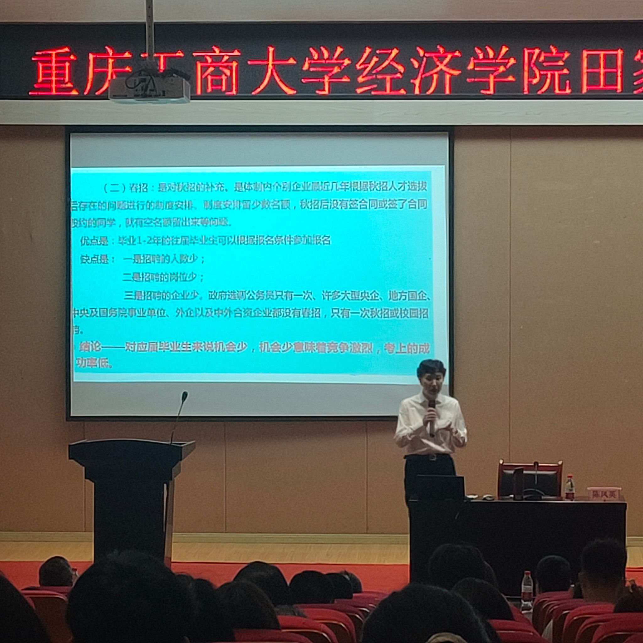 陈凤英从校园招聘对大学生的重大意义、重庆及全国市场校招情况、如何准备校园招聘考试、案例分享等四个方面,娓娓道来,深入浅出,帮助同学们厘清就业形势,了解就业政策,提升就业技巧。宋瑛院长最后给同学们做了就业动员,并在总结讲话中指出,产学研论坛是行业精英进校园系列活动之一,通过不断搭建行业精英进校园平台,请行业精英与同学们分享人生经历和经验,使同学们能够主动对接社会,提前锻炼好各项技能,为高质量就业做好准备。