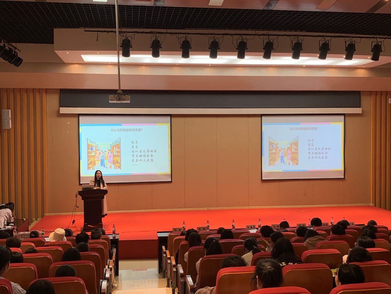 讲座中,张璐老师以贴近同学们宿舍生活的真实场景为切入点,详细列举、分析讲解了宿舍生活中常见的矛盾及产生宿舍关系紧张的主要原因。张璐老师邀请同学们提出自己在宿舍关系中遇到的问题,耐心聆听、细心分析、贴心解答,并向同学们传授了巧用“非暴力沟通四步法”来解决宿舍矛盾、改进与室友的相处模式。在恋爱关系的讲授中,张璐老师聚焦恋爱双方的情感需求、沟通方式等方面,就“你如何理解爱情?”以及“如何把握相处的亲密边界”两个话题引导同学们展开讨论,帮助同学们认识到健康的恋爱关系应建立在相互尊重、理解与沟通的基础上,并提醒同学们在情感管理中保持理性,避免因情感问题影响到自己的学习和生活。