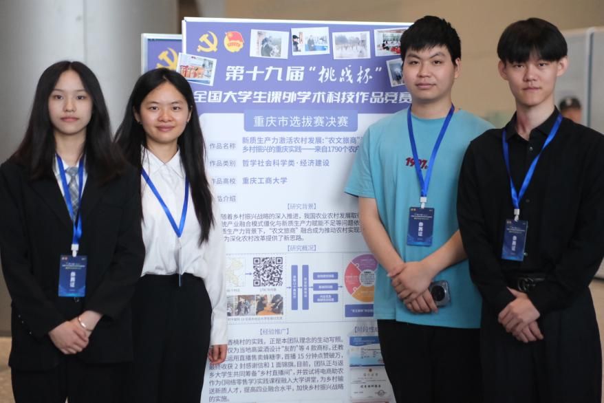 6月5日至6日期间,第十九届“挑战杯”全国大学生课外学术科技作品竞赛重庆市选拔赛决赛于重庆科学会堂隆重举行。在贸易经济系主任杨海丽教授、王辉博士和张桂君老师的指导下,由我院学生赵顺晶担任队长的《新质生产力激活农村发展:“农文旅商”深度融合促乡村振兴的重庆实践——来自1790个农户的调查研究》项目团队成功入围决赛,以扎实的调研和详实的报告,展现了学科融合创新的力量。